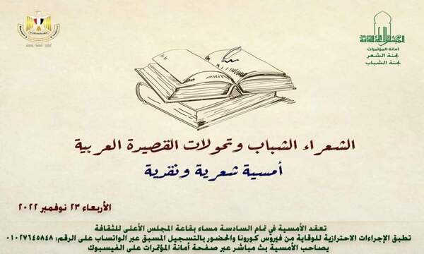 تحت رعاية الأستاذة الدكتورة/ نيفين الكيلاني – وزيرة الثقافة؛ يتشرف الأستاذ الدكتور/ هشام عزمي – الأمين العام للمجلس الأعلى للثقافة؛ والاستاذ/ أحمد سويلم “مقرر لجنة الشعر ” بالمجلس الأعلى للثقافة، والأستاذة الدكتورة/ منى الحديدي – مقررة لجنة الشباب بدعوة حضراتكم لحضور ومتابعة أمسية شعرية ونقدية بعنوان “الشعراء الشباب وتحولات القصيدة العربية” وذلك في تمام السادسة مساء يوم الأربعاء 23 نوفمبر 2022؛ بقاعة المجلس الأعلى للثقافة. يدير الندوة: – الأستاذ عماد غزالي شاعر وعضو لجنة الشعر كلمة لجنة الشباب – أ.د مني الحديدي أستاذة علم الاجتماع جامعة حلوان ومقررة لجنة الشباب المشاركون : – أ.د./ أحمد الصغير أستاذ مساعد كلية الآداب جامعة الوادي الجديد – أ.د./ حمدي سليمان أستاذ علم الاجتماع والانثروبولوجيا بكلية الآداب جامعة العريش وعضو لجنة الشباب – د./ تامر فايز أستاذ الأدب الحديث والأدب المقارن المساعد بقسم اللغة العربية بآداب القاهرة يعقب الندوة أمسية شعرية للشعراء الشباب: – محمد المتيم (صحفي ومحرر أدبي وشاعر) – وسام دراز (شاعر) – أحمد إمام (شاعر ومترجم عن الألمانية) – يونس أبو سبع (شاعر) – مي منصور (صحفية بمؤسسة روز اليوسف وشاعرة) – – آمال ناجي (شاعرة) – حبيبة الزين (شاعرة) – د. سحر كرم محسن (شاعرة) – استشارى الأشعة التشخيصة في مراكز كايروسكان للأشعة