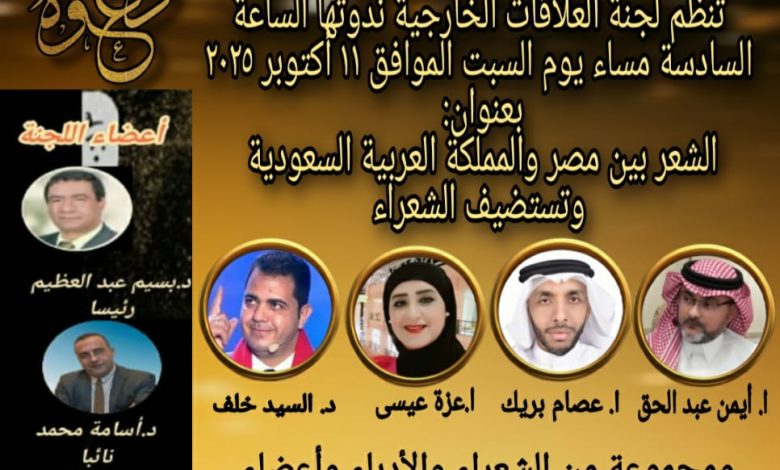 تدعو لجنة العلاقات الخارجية بالنقابة العامة لاتحاد كتاب مصر، إلى حضور ندوتها الموسومة ب.. الشعر بين مصر والمملكة العربية السعودية؛ حيث تُضَيِّف اللجنة برئاسة الدكتور بسيم عبد العظيم :