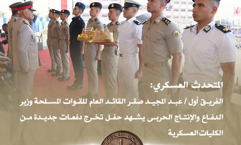 شهد الفريق أول / عبد المجيد صقر القائد العام للقوات المسلحة وزير الدفاع والإنتاج الحربى مراسم الإحتفال بتخريج دفعات جديدة من الكليات العسكرية ، الدفعة ( 76 ) بحرية دفعة الفريق / تامر عبد العليم محمـد والدفعة ( 62 ) فنية عسكرية دفعة الفريق فخرى / محمـد سعيد العصار والدفعة ( 8 ) كلية الطب بالقوات المسلحة دفعة اللواء طبيب / محمـد سعد الدين محمـد على عمر والدفعة ( 5 ) من حملة المؤهلات العليا والدورة ( 2 ) فروسية دفعة الفريق أول / صدقى صبحى والدفعة ( 4 ) ضباط متخصصين دفعة الفريق / إبراهيم عبد الغفور العرابى وذلك بحضور عدد من الوزراء والفريق / أحمد خليفة رئيس أركان حرب القوات المسلحة والفريق أول ركن / صدام حفتر نائب القائد العام للجيش الوطنى الليبى وعدد من المحافظين وقادة الأفرع الرئيسية وعدد من قادة القوات المسلحة والملحقين العسكريين ورؤساء الجامعات والشخصيات العامة والإعلاميين وأسر الخريجين .