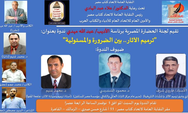 ” تقيم لجنة الحضارة المصرية القديمة بالنقابة العامة لاتحاد كتاب مصر ، برئاسة الكاتب والأديب / عبدالله مهدى ندوتها الشهرية تحت عنوان. ( ترميم الأثار بين الضرورة والمسئولية ) وذلك يوم السبت الموافق ١ من نوفمبر عام ٢٠٢٥ م ، الساعة الرابعة عصرا ، بمقر النقابة العامة لاتحاد كتاب مصر ( ١١ أ شارع حسن صبرى بالزمالك ) ، ويتحدث فيها كل من :–