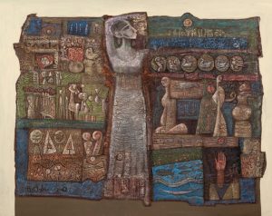 تعكس لوحاته علاقة متجذرة بين الإنسان والمكان، بين المادة والروح، حيث يتحول اللون إلى ذاكرة، والملمس إلى أثر، والرمز إلى دعوة للتأمل في معنى الاستمرارية، شخصياته التي تنهض من عمق اللوحة تحمل ملامح الأبدية، وكأنها تعود لتذكرنا بأن الحضارة المصرية لم تكن يومًا ماضٍ، بل هي حضور متجدد في كل لحظة إبداع.