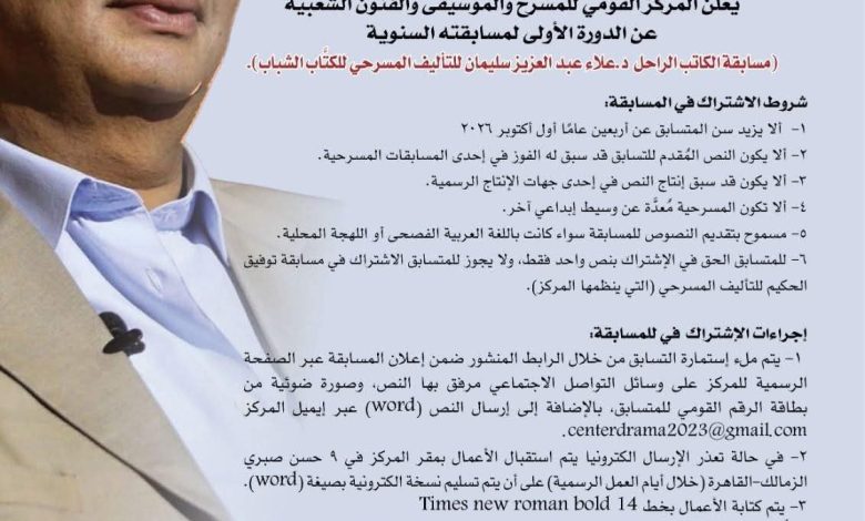 في إطار خطة وزارة الثقافة المصرية لدعم الكتّاب المسرحيين الشبان وتقديم جيل جديد من المبدعين في مجال الكتابة المسرحية، يعلن المركز القومي للمسرح والموسيقى والفنون الشعبية عن انطلاق الدورة الأولى من مسابقة الكاتب الراحل الدكتور علاء عبد العزيز سليمان للتأليف المسرحي للكتّاب الشباب للعام 2025 / 2026، وذلك برعاية ودعم الدكتور أحمد فؤاد هنو وزير الثقافة، وبإشراف المخرج الكبير هشام عطوة رئيس قطاع المسرح.