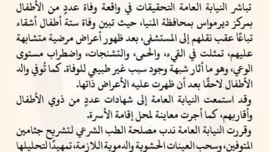 تُباشر النيابة العامة تحقيقاتها في واقعة وفاة عدد من الأطفال ووالدهم بمركز ديرمواس بمحافظة المنيا في وقت سابق، أمرت النيابة…